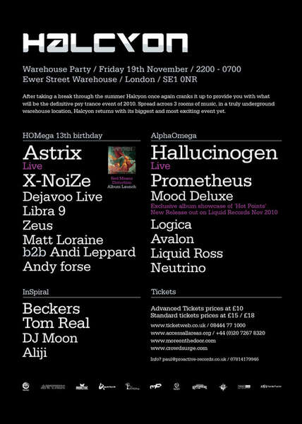 After taking a break through the summer Halcyon once again cranks it up to provide you with what will be the definitive psy trance event of 2010. Spread across 3 rooms of music, in a truly underground warehouse location, Halcyon returns with its biggest and most exciting event yet.